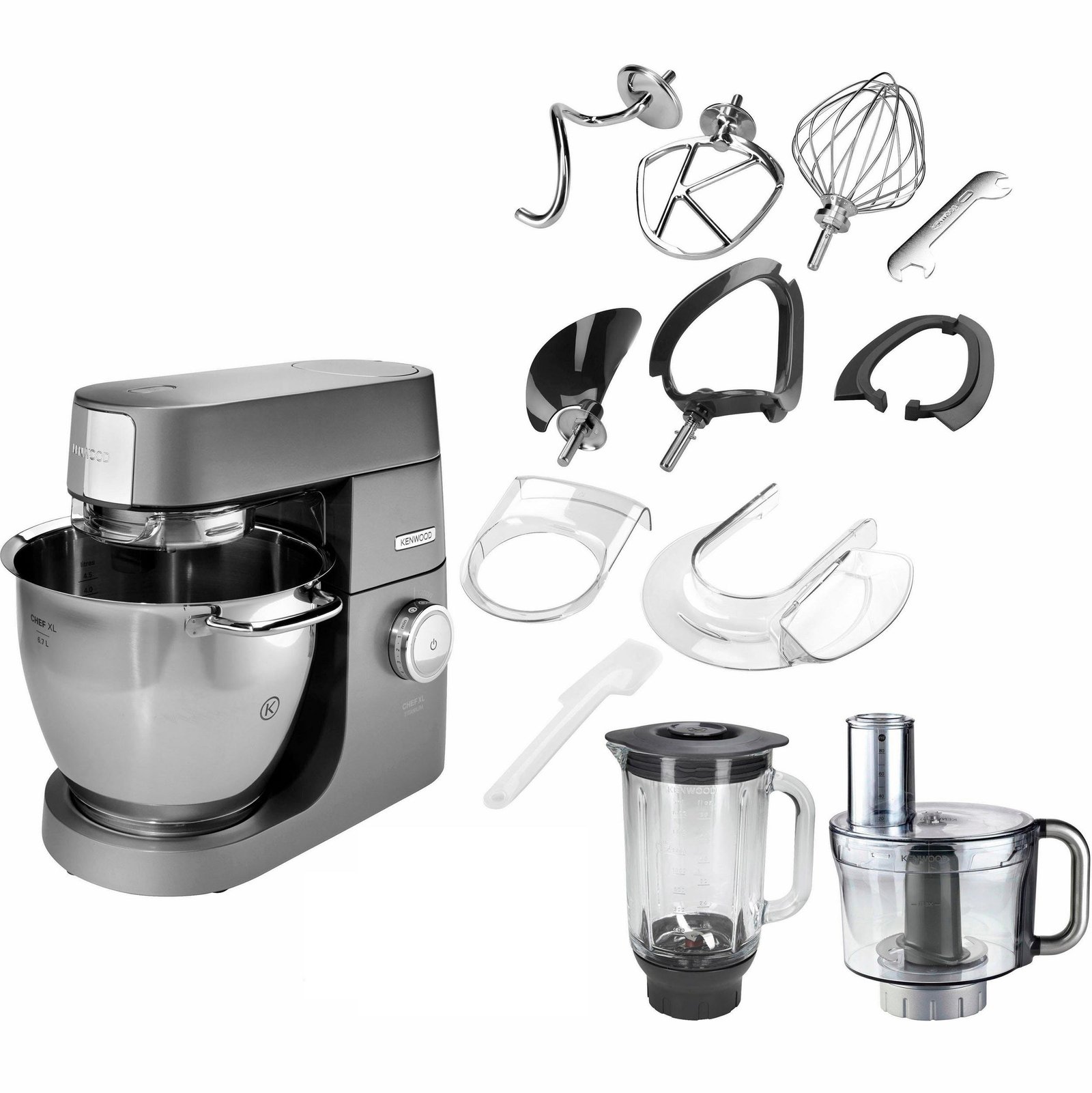 Mitgelieferte Rührelemente : 1x K-Haken (Edelstahl), 1x Ballonbesen (Edelstahl), 1x Knethaken (Edelstahl), 1x flexibles Rührelement (Kunststoff/Gummi), 1x Rührelement (Kunststoff)