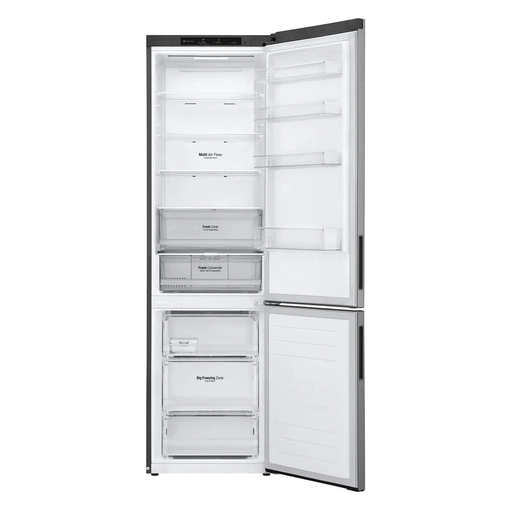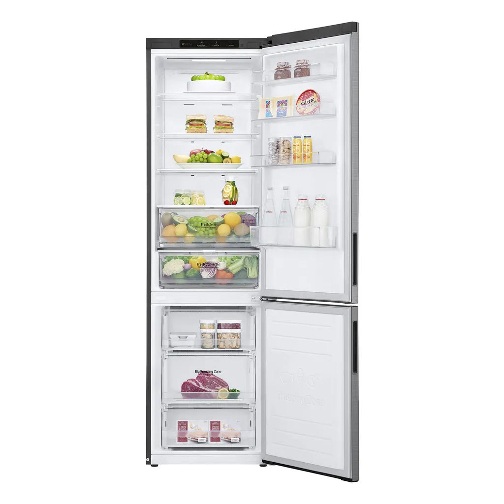 LG GBP62PZNAC.APZQEUR. Nutzinhalt Gesamteinheit: 384 l. Türanschlag: Rechts, Display-Typ: LED. Klimaklasse: SN-T, Geräuschpegel: 35 dB. Nutzinhalt Kühlschrank: 277 l, NoFrost-Funktion (Kühleinheit), Multi Airflow System (Kühlschrank). Nutzinhalt Gefrierfach: 107 l, Gefrierkapazität: 12 kg/24h, NoFrost-Funktion (Gefriereinheit). Fresh Zone Fach. , Jährlicher Energieverbrauch: 110 kWh. Produktfarbe: Edelstahl