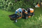 Der STIHL Rasentraktor RT 5097 mit 95 cm Schnittbreite erweist sich bei der Pflege umfangreicher Flächen als wahrer Allrounder. Die Windflügelmesser und das STIHL Fangleitsystem gewährleisten einen sehr guten Transport des Schnittguts in den Fangkorb. Unter Verwendung von Zubehör-Kits kann die Maschine auch zur Grasablage oder zum Mulchen umgerüstet werden. Für den Antrieb sorgt der verbaute STIHL EVC 4000 Benzinmotor. Mit dem STIHL spezifischem 1-Pedal Fahrantrieb läßt sich das Gerät komfortabel Manövrieren und Rangieren. Alle Bedienungsfunktionen sind ergonomisch um den werkzeuglos verstellbaren Fahrersitz herum angeordnet. Der Anwender genießt dabei viel Beinfreiheit. Der 250 Liter fassende Grasfangkorb läßt sich bequem vom Fahrersitz aus per Säbelgriff abkippen und entleeren. Mit der integrierten Anhängevorrichtung läßt sich ein Transportanhänger ziehen oder sonstiges Zubehör anbauen.